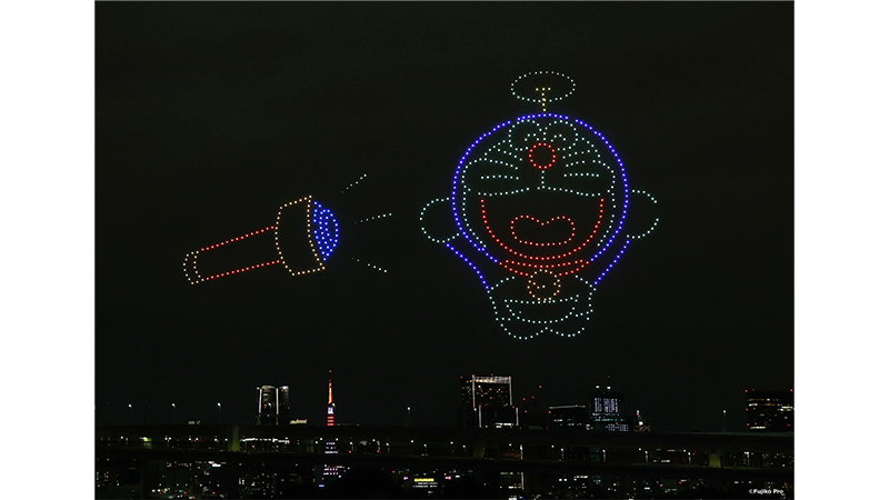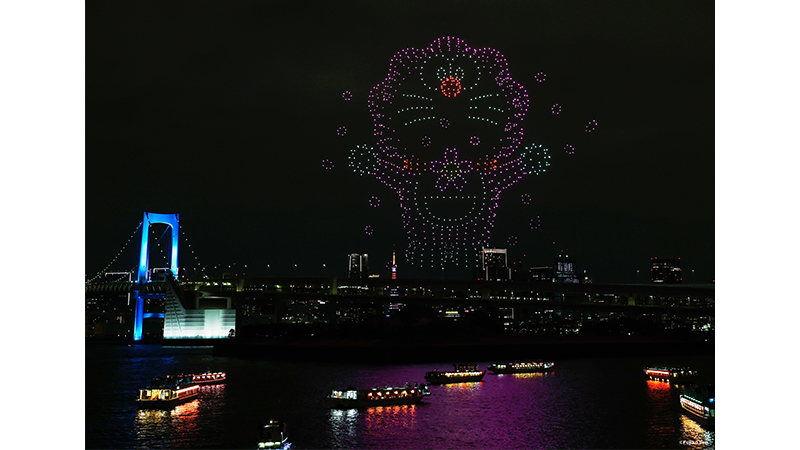 そして、先週3月7日(土)には、お台場にて『100%ドラえもん&フレンズ ドローンショー』が開催(かいさい)されたよ。今回のドローンショーは、『100%ドラえもん&フレンズ in 東京』の開幕を祝うとともに、アニメ放送に先がけて日本会場オリジナルドラえもんが夜空にすがたをあらわすなど、壮大(そうだい)な物語の幕開けをつげるイベントとなりました! 高さ100mを超える巨大(きょだい)なドラえもんが出現(しゅつげん)した瞬間(しゅんかん)、会場からは大きな歓声(かんせい)が…。のび太やおなじみの仲間たちが夜空を舞台(ぶたい)に壮大な物語をくり広げ、東京湾(わん)の開放的な景観と融合(ゆうごう)した幻想(げんそう)的なひとときとなりました。