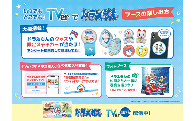 ブース内では、ファミリーで楽しめるTVerの活用方法を体感いただけるほか、TVerで『ドラえもん』をお気に入り登録すると、大ヒット上映中の『映画ドラえもん 新・のび太の海底鬼岩(きがん)城』のサンバイザーがもらえたり、アンケートに回答していただくと『ドラえもん』グッズや限定(げんてい)ステッカーが当たるチャンスも! 楽しさいっぱいのイベントにぜひ遊びに来てね!