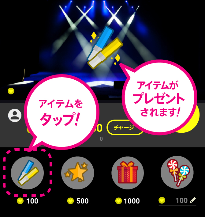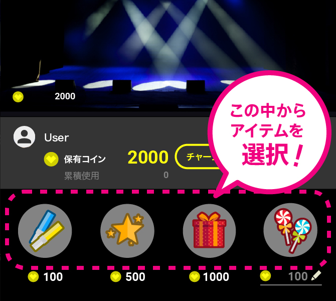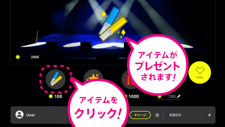 「この配信おもしろい!」、「配信に出ている出演者の方を応援したい」など、ユーザーの皆様の思いをアイテムに乗せて届けよう!