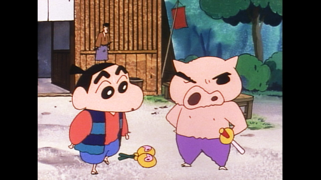 ぶりぶりざえもんと一緒に、借金取りから、娘とおじいさんを助けるしんのすけ。