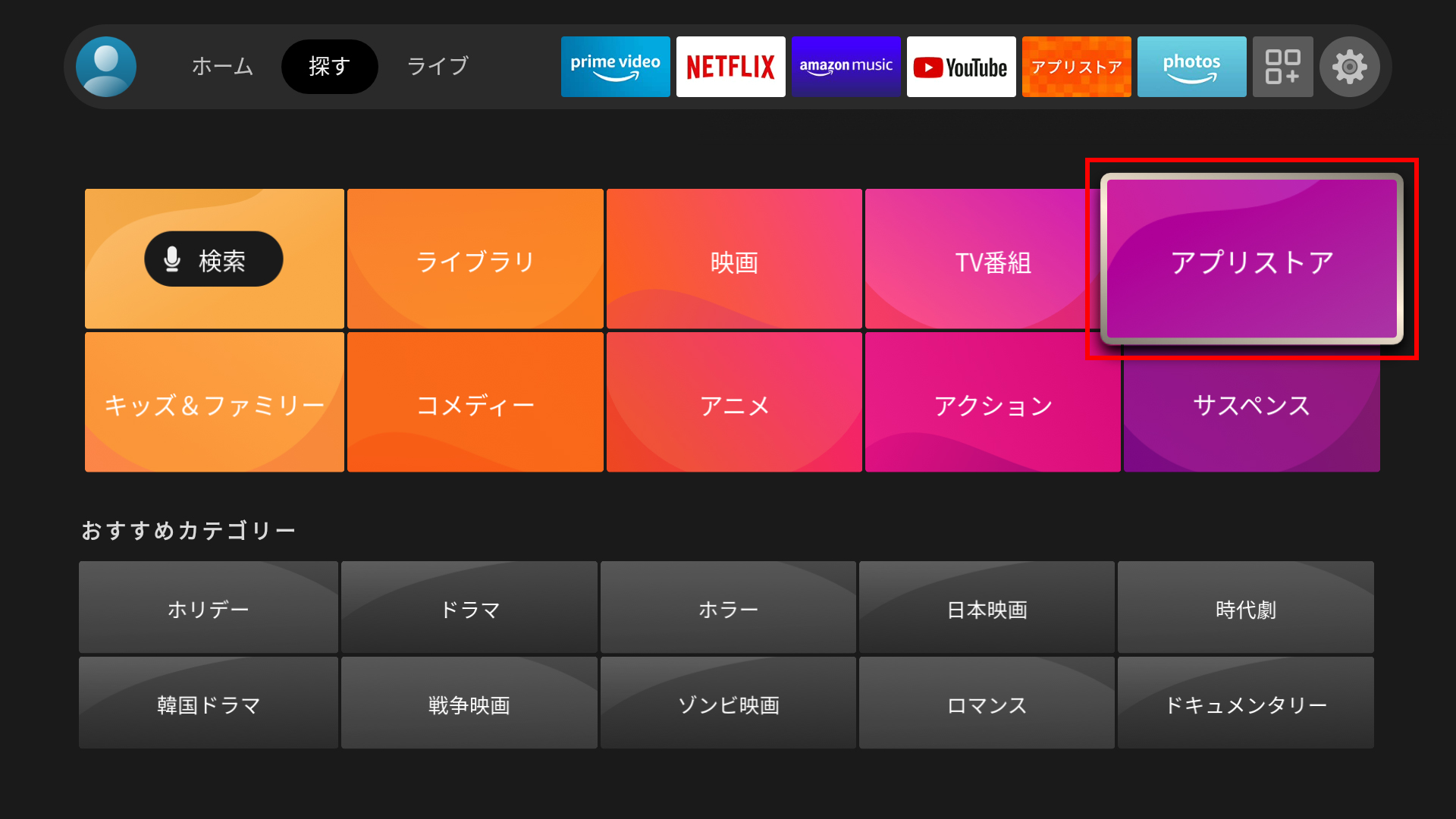 (1)AmazonFireTVStickを起動後、「探す」からアプリストアを選択してください。