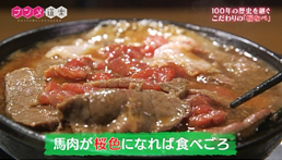 新鮮な馬肉と、伝統の味付けで甘辛く煮た、すき焼き風お鍋。