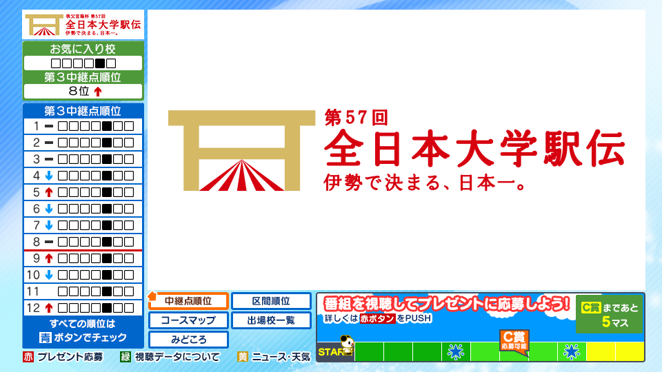 - ・ゴーちゃん。が進んだマスは現在ご使用のテレビ受信機の中に保存されています。2台以上のテレビ・受信機をお持ちの場合には、同じ機器でご参加ください。