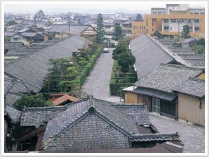 槙垣と石畳をはさんで静かに息づく歴史空間、ここは江戸末期に旧紀州藩士が松阪城警護のため移り住んだ武家屋敷です。このような組長屋は全国でも大変珍しく、今も人々の暮しが営まれています。
