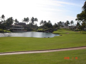 「コオリナ」というのは、ハワイの言葉で「喜びの結晶」という意味。かつてハワイの王族の保養所があったエリアで、オアフ島の中でも最も静かで広大なリゾートエリアのひとつです。ちなみにクラブのシンボルマークは「てんとう虫」(写真参照)。てんとう虫といえば、「愛と幸福の象徴、神様の使い」といわれるくらいですからこのコースは人々に幸をもたらす場所といえるかもしれません。 |
