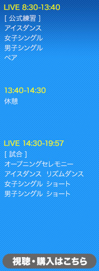 テレ朝動画では15日から全競技・全選手(エキシビションを除く)を公式練習を含めてLIVE配信! 配信チケットの販売数量が多くなり、ライブ配信に影響が出ると判断した場合、それ以降の配信チケット販売を停止する場合がありますのでご注意下さい。お早めのご購入をお願い致します。