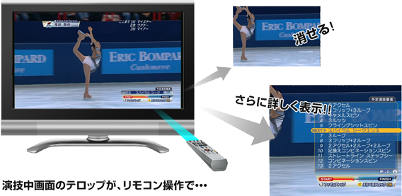 2008年度グッドデザイン賞を受賞した「えらべるテロップ」は、TVのリモコンで操作できる、データ放送だけのテロップ機能です。テロップの表示・非表示を行えるほか、さらに詳しい情報を、画面を縮小することなくお楽しみいただけます。演技中の選手の演目構成をわかりやすく一覧表示!次にどんな技を披露してくれるかが一目瞭然です!!是非リモコン片手にお楽しみ下さい。