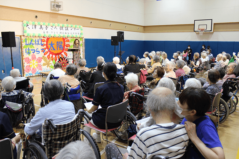 7月に入り夏本番、すでに梅雨明けしてしまったかのような暑い日が続いていますが、歌謡ショーを心待ちにしていた約100人の利用者や関係者の皆さんが、施設1階の体育館に集まりました。
