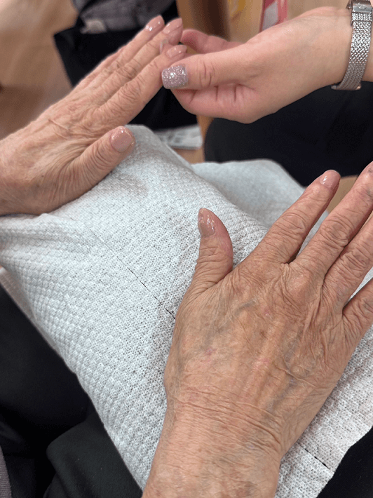 ハンドトリートメントでは、手や指を対象部位に軽くあて、やさしい力で皮膚を丁寧に擦りながら、手元のケアを行いました。