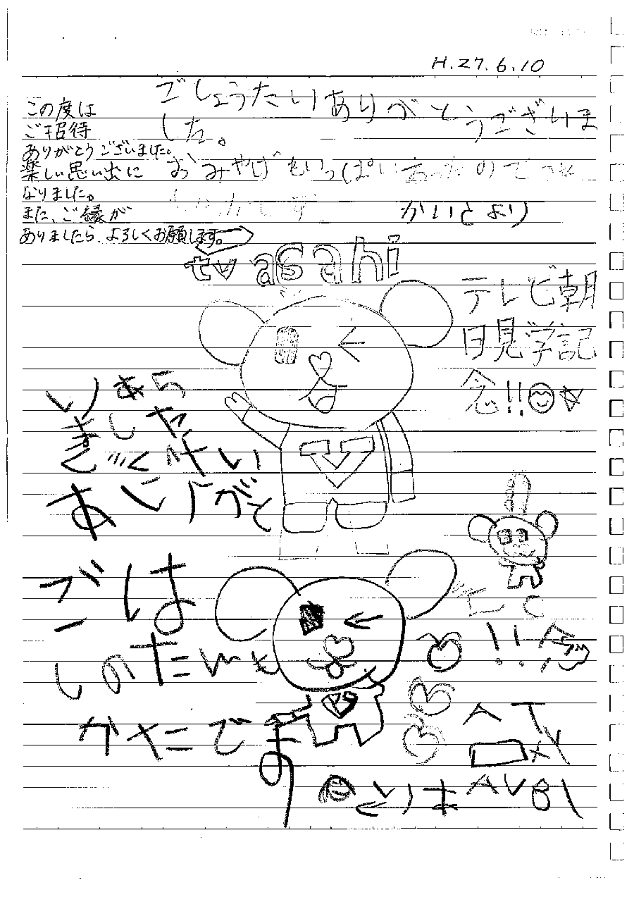 テレビ朝日さまへ 今日は楽しかったです。また、行きたいです。みなさん、お仕事がんばってください。今日はありがとうございました。