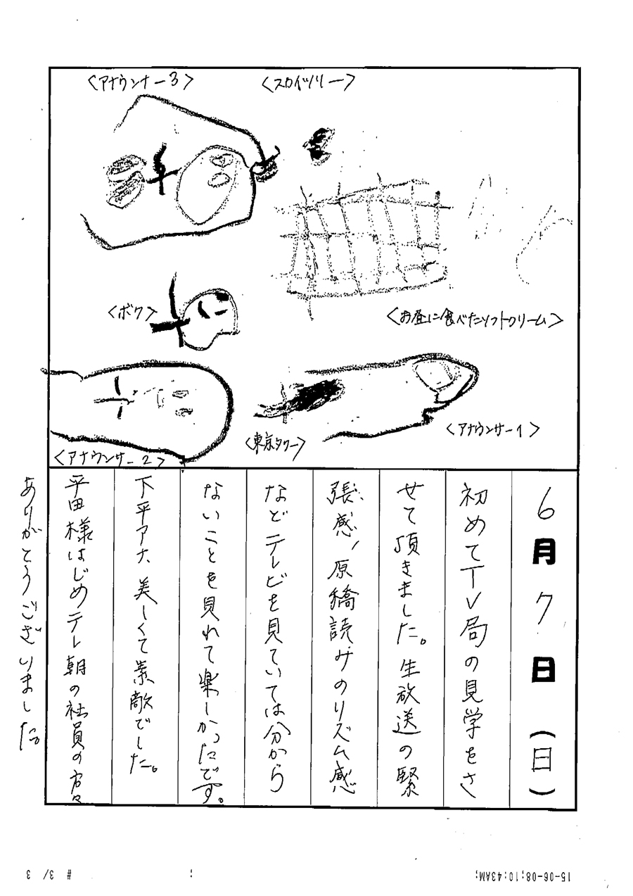 わたしは、はじめてテレビ朝日にいって、あいぼうやてつこのへやにいったりして1かいもとてもたのしかったです。そしてやさしくあんないしてもらってツアーがはじまりました。みんなが、りはーさるをしているところをみました。しつもんたいむもして、だれががめんをきりかえているんですかときいたら、「いいしつもんですね」といわれて、さぶというおへやへあんないしてもらいました。そこは、ぼたんがたくさんあってすごいおへやでした。そしてたのしい一日がすごせました。また、いきたいです。ゴーちゃん。みなさん、おうえんしています。