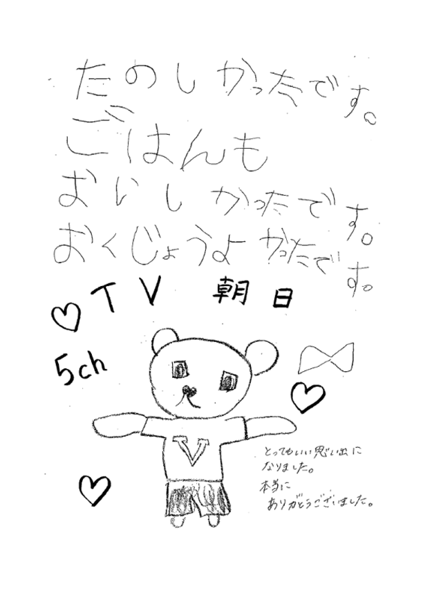 ぼくは、テレ朝で3番目くらいに広い放送室で写真をとったことや、上の階から生ほうそうを見たことが楽しかったです。ほうそうしている時は、出ている人がみんな立っていました。立っていてつかれないのかな~~と思いました。そのあと、テレ朝のレストランでお母さんと食事をしました。食べたものはヒレかつと、ごはんと、みそしると、野菜とアイスも食べました。アイスはソーダ味でラムネが入っていました。つめたくておいしかったです。また、テレ朝に行きたいです。しょうたいしてくれてありがとうございます。
