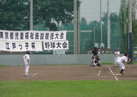 7月23日(水)・24日(木)、調布市・調布基地跡地運動広場で「江戸っ子杯争奪東京都児童福祉施設競技大会2014 野球の部」が開催されました。今年もこの大会らしく小学生・中学生の男子女子で構成された個性あふれる9チーム、約140名の児童が参加、一日目に予選リーグ戦、二日目に決勝トーナメントと全13試合の熱戦が繰り広げられました。審判団は今年も三鷹市軟式野球連盟の皆さんに全面協力して頂きました。
