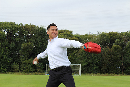始球式に来て頂いたのは千葉ロッテマリーンズで「魂のエース」と称された投手、黒木知宏さん。ゆっくりと投げた球をキャッチャーの子がきちんとミットに収めたのを見て、「よし。レベル2!」、「次はレベル3いくぞ!」と速度を上げて投球。「ナイスキャッチ!」という掛け声が何度も響く異例の始球式となり、さっそく子どもたちを沸かせました。