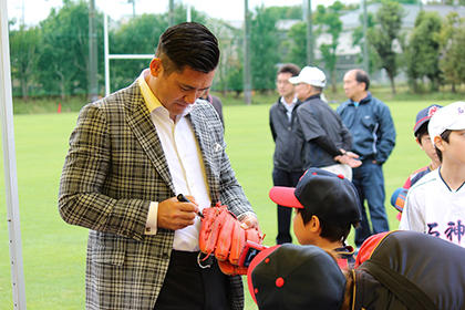 試合の合間には、黒木さんが子ども相手にキャッチボールをしたり、次の試合へアドバイスをしたり。また、快くサインや写真撮影を受けて頂き、並んだ子どもたちはカバンやバッド、頬にまでサインをもらい、大喜びでした。