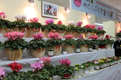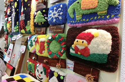 会場には、クリスマスリースや正月飾り、利用者が大事に育てた色とりどりのシクラメンなども、所狭しと並べられています。12月6日まで開催しています。