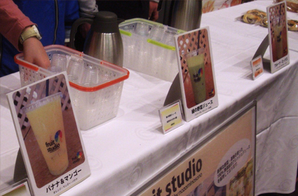 当事業団は、製品部門に<テレビ朝日福祉文化事業団大賞>を贈呈しています。今年は、カテゴリーⅠの[食品]69品目とカテゴリーⅡの[非食品]37品目の中から、成田市のぞみの園「フルーツスタジオ・フレッシュジュース」に、オリジナルグッズの副賞を添えて大賞を授与しました。これは、バナナ&マンゴー・フルーツミックス・緑の野菜ジュ―スの3点でのエントリーで、水や砂糖、添加物を一切使わない正真正銘100%のミックスジュースです。他のフレッシュジュースと比べても果物や野菜本来の味が楽しめる濃厚な仕上がりとなっています。果実のカットとジューサーを使ったベース作りを利用者の皆さんが行うなど、製品作りへの積極的な関わり方も高く評価されました。デザインでも、カラフルでスタイリッシュなロゴマークが効果的でした。