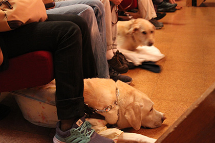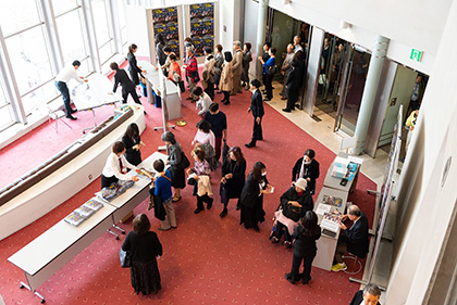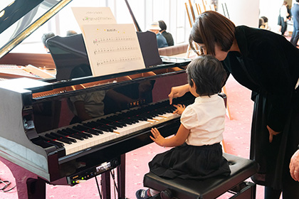 ロビーには、抱っこスピーカー「ハグミー」と髪の毛で音を感じる装置「Ontenna」の体験・貸し出しブースを設けました。聴覚に障がいのある方だけでなく、一般の方にも触れていただきました。また、ヤマハと東京藝術大学COI拠点が共同で開発した「だれでもピアノ」を体験していただくブースも設けました。片手の1本指だけでメロディを奏でると、そのメロディのタイミングや強弱に合わせて自動で伴奏とペダルがついてきます。初心者や障害のある方でもピアノを上手に演奏できてしまうというグランドピアノを体験しようと、ロビー内には行列ができていました。