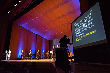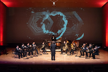 第2部は、視覚や聴覚に障がいを持つ方も音楽を楽しめるような工夫を凝らした「五感で楽しむブラスアンサンブル」。東京藝術大学出身のプロオーケストラ奏者を主体として結成されたブラスアンサンブル・ゼロによる演奏と映像とが共演するステージです。