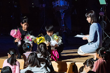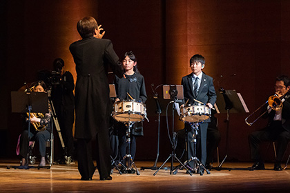 続いて4曲目では、筑波大学附属聴覚特別支援学校の小学6年生の2人の生徒にスネアドラムで演奏に加わっていただきました。タブレットと音量を視覚化したアプリを使用することで、聴覚に障がいがある方でも自分の演奏している音のタイミングと音量が直感的に把握することができます。大きなホールでプロの演奏者と共演するのはたいへん緊張したことと思いますが、立派に演奏をしてくれました。演奏後には支援学校の後輩たちがステージに駆け寄り、2人に花束を渡している光景も感動的でした。