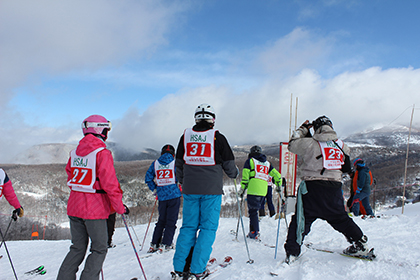 一同は25日午後、三々五々各地から集合。17時から宿泊先のホテルシュワルツ内で開会式に臨み、選手宣誓、コースやルール説明、ゼッケンの配布を行いました。翌朝、選手たちは入念に準備を行い、リフトが動き出すのを待って山頂に近いゲレンデのスタートポイントに集合。インスペクション(コース下見)を終え、10時30分から初級、中級、上級、ゲストメーション(健常者)の4つのクラスに分かれ、順番に競技をスタートしました。