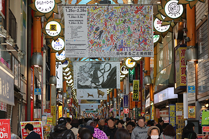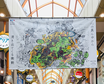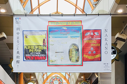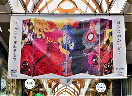 一日15万人の乗降客があるJR中野駅。北側改札口の入り口にまずはイベントの大きな横断幕が目に付きます。ロータリーから駅北側に一直線に伸びる「中野サンモール商店街」は中野のメインストリートで、一日平均5万人が行き交います。都内でも有数のこの商店街に入ると、アーケードの高い天井から縦1.8メートル、横3メートルの大きな作品のバナーが吊るされた「空中ギャラリー」が展開され、裏表で計14作品が多くの買い物客や通行人の目を楽しませるようになっています。