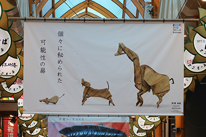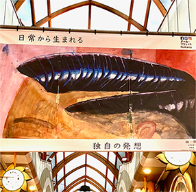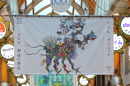 また、駅から南側の大通りに伸びる「中野南口駅前商店街」では、全23枚の作品バナーがアーケードを飾り、ロビー内で「アール・ブリュット」の作家の作品を常時展示している店舗もありました。この商店街では毎年、商店街の皆さんの手でバナーの設置・撤収作業を行って頂いているとのことです。