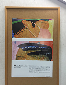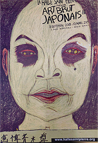 「サンモール」の巨大バナーで、大胆な構図で髪の毛のある頭部だけが描かれたのは、岡一郎の作品です。1966年生まれ。現在は広島県内の福祉施設でしいたけ栽培をしていますが、作業で山に入っている以外は、昼夜を問わず、ほとんど創作活動に費やしているといいます。多くの作品は、人の頭部、中でも髪の毛の部分だけにクローズアップして画面が構成され、独特の曲線で描かれ、印象的な色彩で塗られています。ポスターでも2点が紹介されました。