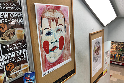 このイベントのメインのポスターに採用されたのは、福井誠の作品。1982年生まれで長崎県の自宅で創作活動を行っています。多彩な色彩の動物や宇宙人のような生き物が画面いっぱいに描かれ、どこにも目が描き入れられているのが特徴です。統合失調症を発症し、幻覚症状で「だれかに見られている」という意識が離れなかったといい、こうした絵を描くことで気持ちが落ち着くのだそうです。「サンモール」の巨大バナーにも別の作品が飾られ、「ブロードウェイ」内でもポスターが2点、さらに「中野駅北口」にある銀行のロビーでも作品が数点展示され、今回のイベントを代表する作家となりました。