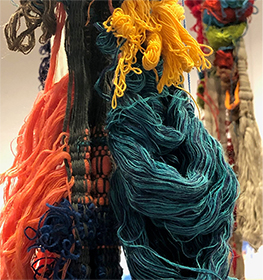 また、連動企画の「なかのZERO」での展覧会を代表する作品を制作したのが、1963年生まれのカズ・スズキです。鮮やかな何色もの太い糸を、織り機を使って独自の方法で縦横を複雑に織り込み、何か所も瘤のような形状をもった数メートルの細長くカラフルな糸のかたまりとして造形し、それを天井から何本もぶら下げたインスタレーション。まさに美しい現代アートといえる作品となっています。栃木県の施設で暮らし、週5日、決まった時間だけ工房に入ってもくもくと織り続けているそうですが、一作に数カ月を要し、年間わずか数作という寡作の作家です。