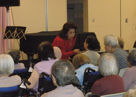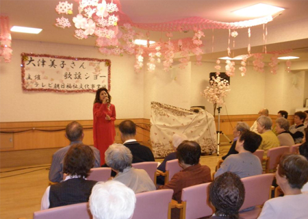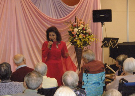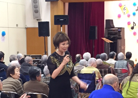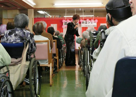 2月24日、江戸川区の特別養護老人ホーム「清心苑」を大津美子さんが訪問し歌謡ショーを開催しました。当日は曇り空で多少肌寒い日でしたが、会場には120名以上のお年寄りに集まり、大津美子さんが「♪リンゴの唄」を唄いながら会場に登場すると、大きな拍手が起きました。続いて「♪東京アンナ」「♪愛の詩を花の詩を」、またメドレーで石原裕次郎さんの「♪夜霧を今夜も有難う」「♪港町・涙町」「♪恋の町札幌」「♪湖畔の宿」「♪さよならルンバ」を熱唱。曲の合間には大病を患った時の話や、歌手生活をスタートした時にお世話になった先輩歌手や作曲家の先生の話をされ、皆さんも熱心に聞き入っていました。中盤では「♪小雨降る径」「♪いのちの限り」、続くエンディングは「♪銀座の蝶」「♪グッド・ナイト」、最後に大ヒット曲「♪ここに幸あり」を唄うと涙を流すお年寄りの姿も見られました。皆さんからの大きな拍手に包まれ終演となり、花束が贈られ記念撮影を行いました。施設長や職員の皆さんから温かい言葉をいただき施設を後にしました。