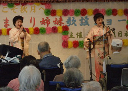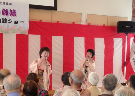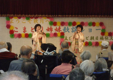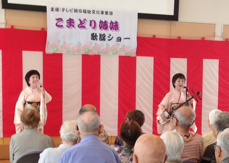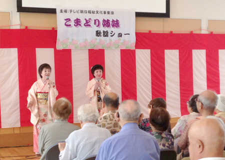 8月13日(水)、練馬区の特別養護老人ホーム「秋月」をこまどり姉妹さんが訪問し、歌謡ショーを開催しました。当日は、天候に恵まれ暑さも一段落した穏やかな日となりました。会場には100名を超えるお年寄りの皆さんが集まり、和服姿のこまどり姉妹さんが会場に登場すると、大きな拍手が起こりました。「♪ソーラン渡り鳥」「♪三味線姉妹」で開演し、歌の合間には、生まれ育った北海道で幼いころ生活に窮して家族で苦労し、デビュー後は熱心なファンから暴行を受けたり、大変な大病を患ったりと波乱万丈なお二人の人生が語られ、お年寄りの皆さんもうっすら涙を浮かべながら聞き入っていました。「♪未練ごころ」「♪お吉物語」「♪九段の母」「♪岸壁の母」と続き、後半の「♪二輪草」では三味線に併せてお姉さんの栄子さんが踊りを披露、最後に新曲「♪ラーメン渡り鳥」を熱唱し終演となりました。最後にお年寄りから花束が贈られ、皆さんと記念撮影をした後、施設長、職員全員に見送られ施設を後にしました。