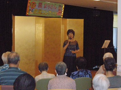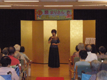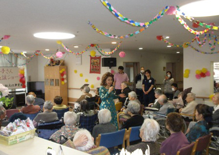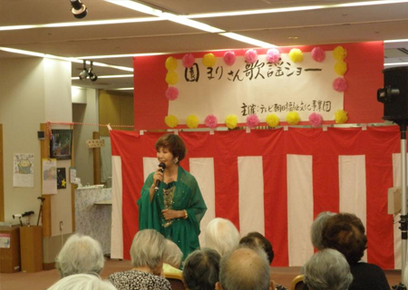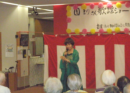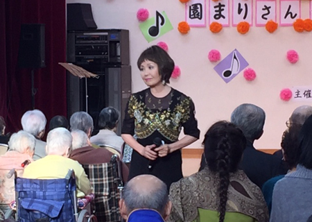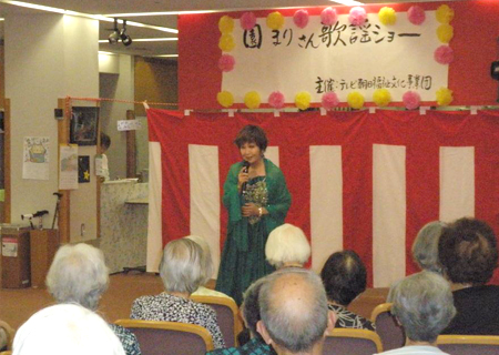 9月12日、横浜市金沢区の介護老人保健施設「こもれび」を園まりさんが訪問、歌謡ショーを開催しました。すがすがしい爽やかな秋晴れに恵まれ、会場には約100名の皆さんが集まり、園まりさんが登場すると、大きな拍手が起こりました。「♪逢いたくて逢いたくて」からスタートし「♪何も言わないで」「♪夢は夜ひらく」「♪大阪の女」とヒット曲を歌い、合間にはお年寄りと握手を交わし、会場内を回って集まったたくさんの皆さんに言葉をかけたりと会場には親密な空気が流れました。高齢者施設に入居中のお母様の介護やご自身の病気、家族との別れにも触れ、以前映画に出演された時のエピソードに加えて最近久しぶりに出演した映画の話など盛りだくさんのお話に皆さん楽しみながら熱心に耳を傾けていました。ショーの中盤には「♪なんでもないわ」「♪可愛いベイビー」「♪ヴァケーション」「♪ここに幸あり」「♪ふるさと」「♪青い山脈」、後半には「♪もう一度逢いたくて」「♪逢いたくて逢いたくて」「♪愛燦燦」を熱唱し会場は拍手喝采に包まれました。以前から園まりさんの大ファンというお二人のお年寄りから花束が贈られ、全員で記念撮影して終演、「長年のファンなのでお会いできて具合が良くなった気がします」というお年寄りの言葉に園まりさんも感激されたようでした。