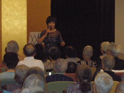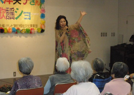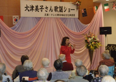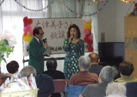 10月21日、渋谷区の特別養護老人ホーム「正吉苑」を大津美子さんが訪問して歌謡ショーを開催しました。当日は曇り空で多少小雨がぱらつくあいにくの天気でしたが、会場には約80名のお年寄りが集まりました。大きな拍手に迎えられて大津美子さんが登場し、大ヒット曲の「♪ここに幸あり」から歌謡ショーがスタートしました。続いて「♪東京アンナ」「♪東京は恋人」を熱唱し、曲の合間には以前大病を患った時の話や、歌手生活をスタートした時にお世話になった先輩歌手や作曲家の先生の話をされ、皆さん熱心に聞き入っていました。中盤「♪恋の町札幌」「♪湖畔の宿」「♪さよならルンバ」のメドレーを披露した後は「♪小雨降る径」「♪いのちの限り」「♪銀座の蝶」「♪グッド・ナイト」を立て続けに唄い会場が盛り上がる中、エンディングに再び「♪ここに幸あり」、皆さんからのアンコールの声に応えて「♪サンパウロチャチャチャ」を唄って終演となりました。10曲以上にのぼるショーに満足された様子のお年寄りから花束が贈られ記念撮影を行った後、職員の方に見送られ施設を後にしました。