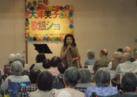 7月9日、多摩市の特別養護老人ホーム「和光園」を大津美子さんが訪問して歌謡ショーを開催しました。当日は、多少小雨がぱらつく曇り空でしたが、会場には100名以上のお年寄りとそのご家族、職員の皆さんが集まり、大津美子さんが登場すると、大きな拍手が沸き起こりました。「♪東京アンナ」からスタートし、「♪東京は恋人」「♪愛の詩を花の詩を」を熱唱。曲の合間には以前大病を患った時の話や、歌手生活をスタートした時にお世話になった先輩歌手や作曲家の先生とのエピソードなどを話され、皆さん熱心に聞き入っていました。中盤では「♪小雨降る径」「♪いのちの限り」「♪銀座の蝶」「♪恋の町札幌」を、エンディングには「♪グッド・ナイト」、その後大ヒット曲の「♪ここに幸あり」が披露されると、会場は拍手喝采が沸き起こり、涙するお年寄りの姿も見られました。最後にアンコールの声に応え「♪リンゴの唄」を歌って終演、お年寄りから花束が贈られ、皆さんと記念撮影をして終了となりました。お年寄りや職員の方々から温かい言葉をいただき施設を後にしました。