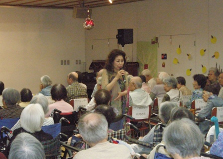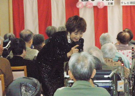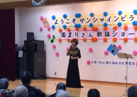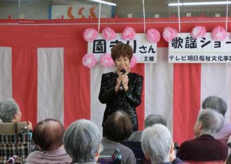 12月10日、東京都福生市特別養護老人ホーム「サンシャインビラ」を園まりさんが訪問、歌謡ショーを開催しました。当日は少し肌寒い一日でしたが、会場には120名近いお年寄りが集まり、園まりさんが、登場すると大きな拍手が起きました。「♪逢いたくて逢いたくて」からスタートし「♪何も云わないで」「♪夢は夜ひらく」「♪大阪の女」と続き、合間には会場内を回って皆さんと握手したり、集まったお年寄りに優しく言葉をかけたりしながら和やかに進行しました。高齢者施設に入居中のお母様の介護の話や、家族との別れ、また最近出演された映画の話などにも触れ、集まった皆さんもそれぞれ熱心に耳を傾けていました。中盤には「♪何でもないわ」「♪可愛いベイビー」「♪ヴァケーション」「♪ここに幸あり」「♪ふるさと」「♪青い山脈」後半には、「♪もう一度逢いたくて」「♪愛燦燦」を熱唱し会場から大きな拍手が起こりました。その後皆さんからアンコールの手拍子に応え「♪スタンド・バイミー」を唄って最後となりました。施設のお年寄り二人から花束が贈られ、全員で記念撮影をして終演、施設長をはじめ職員の皆さんに見送られ施設を後にしました。