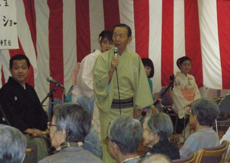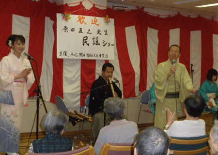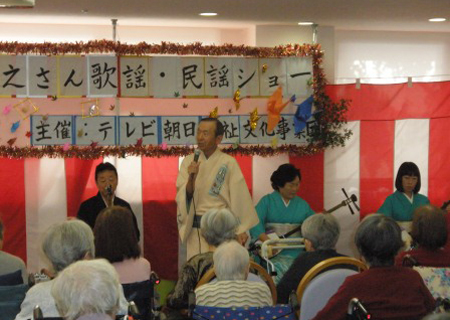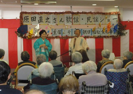 板橋区立特別養護老人ホーム「いずみの苑」を民謡界の大御所、原田直之さんが訪問して歌謡・民謡ショーを開催しました。当日は80名以上のお年寄りが集まり、会場に原田さんが登場すると大きな拍手が起こりました。三味線、尺八、お囃子の生演奏で、「♪新相馬節」「♪大漁唄いこみ」「♪南部牛追歌」「♪武田節」「♪ソーラン節」を会場の手拍子に合わせて立て続けに唄って開演、途中、原田さんの故郷福島県浪江町が東日本大震災で大きな被害を受けた話等をされ皆さんも熱心に聞き入っていました。女性2人がデュエットで「♪安里屋ユンタ」「♪お祭りマンボ」を唄い会場を盛り上げる中、原田さんが再び登場し「♪達者でな」「♪ああ上野駅」を、また三味線を弾かれる奥様と「♪ある夫婦のうた」を披露され会場は和やかなムードに包まれました。東日本大震災の被災地の復興を応援するチャリティーソング「♪花は咲く」を感動的に唄われた後「♪お立ち酒」「♪希望船」で最後となりましたが、その後も会場の皆さんからのリクエストに気軽に応え、最後に「炭坑節」で締めくくりとなりました。お年寄りから花束が贈られ、皆さんとの記念撮影で無事終了、終演後お年寄りの皆さんは口々に「いい唄を聞かせてもらってよかった」「楽しかった」と笑顔で話されていました。