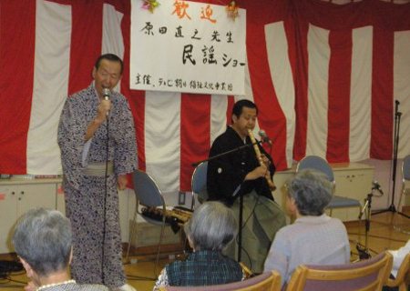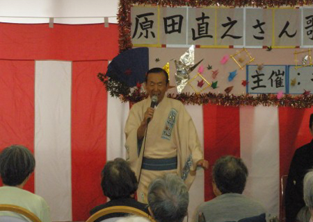 日野市の介護老人保健施設「クローバー」を原田直之さんが訪問して歌謡・民謡ショーを開催しました。当日は天気も良く、約130名のお年寄りの皆さんが集まり、会場に原田さんが登場すると、大きな拍手が起こりました。三味線、尺八、鳴り物、お囃子の生演奏で「♪新相馬節」「♪大漁唄い込み」「♪南部牛追唄」「♪武田節」「♪ソーラン節」を会場の手拍子に合わせて唄い歌謡ショーが始まりました。原田さんが東日本大震災で大きな被害を受けた故郷、福島県浪江町の話をされると皆さんも熱心に聞き入っていました。後半では鳴り物で女性2人がデュエットで「♪安里屋ユンタ」「♪お祭りマンボ」を唄って会場を盛り上げた後、再登場の原田さんが「♪達者でナ」「♪ああ上野駅」、また三味線を弾かれていた奥様と「♪ある夫婦のうた」をデュエットされた後お馴染みの「♪花は咲く」「♪お立ち酒」「♪希望船」の唄で最後となりました。その後も会場のみなさんからのリクエストに気軽に応えて数曲を唄い無事終演となりました。お年寄りから花束が贈られ記念撮影を行った後、皆さんに見送られ施設を後にしました。
