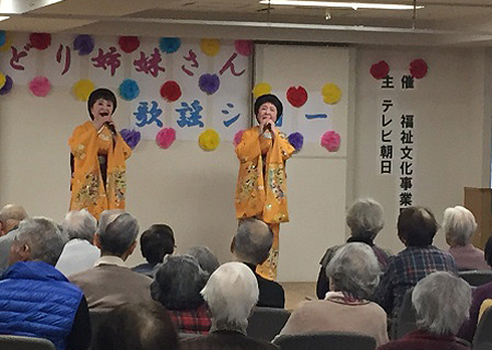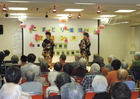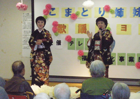 3月23日、渋谷区「けやきの苑・西原」をこまどり姉妹さんが訪問し、歌謡ショーを開催しました。当日はどんよりした曇り空で、少し肌寒い日でしたが、会場には約80名のお年寄りの皆さんが集まり、こまどり姉妹さんが会場に登場すると、大きな拍手が起こりました。オープニングは「♪ソーラン渡り鳥」。続いて「♪浅草姉妹」「♪三味線姉妹」「♪未練ごころ」を大迫力で歌唱。合間には、生まれ育った北海道で、幼いころ生活に窮して家族で苦労したこと、デビュー後は、熱心なファンから暴行を受けたり、大変な大病を患ったりと波乱万丈なお二人の人生が語られ、お年寄りの皆さんも涙を浮かべながら聞き入っていました。中盤では「♪二輪草」で踊りと三味線が披露され、続いて「♪お吉物語」「♪湯島の白梅」「♪岸壁の母」を熱唱し、「♪こまどりのラーメン渡り鳥」で終演となりました。最後にお年寄りからお二人に花束が贈られ、皆さんと記念撮影。艶やかな和服姿のこまどり姉妹さんとの温かい交流にお年寄りが笑顔になり、私たちスタッフも幸せをもらう一日になりました。