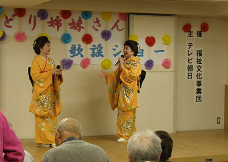 2月18日(水)、三鷹市の特別養護老人ホーム「恵比寿苑」をこまどり姉妹さんが訪問し歌謡ショーを開催しました。当日は、あいにくの雨模様で肌寒く天気には恵まれませんでしたが、会場には、120名を超えるお年寄りの皆さんが集まり、こまどり姉妹さんが会場に登場されると、大きな拍手が起きました。「♪ソーラン渡り鳥」「♪浅草姉妹」で開演し、歌の合間には、生まれ育った北海道で幼いころ生活に窮乏し苦労した話、デビュー後はファンから暴行を受けたり、大病を患ったりと波乱万丈なお二人の人生が語られ、お年寄りの皆さんもうっすら涙を浮かべながら聞き入っていました。中盤では「♪三味線姉妹」「♪未練ごころ」と続き「♪二輪草」では三味線に併せてお姉さんの栄子さんが踊りを披露、後半では「♪お吉物語」「♪湯島の白梅」「♪岸壁の母」、最後に新曲「♪こまどりのラーメン渡り鳥」を熱唱し終演となりました。お年寄りから二人に花束が贈られ、皆さんと記念撮影をした後、施設長と職員の皆さんに見送られてこまどり姉妹さん、我々スタッフも施設を後にしました。