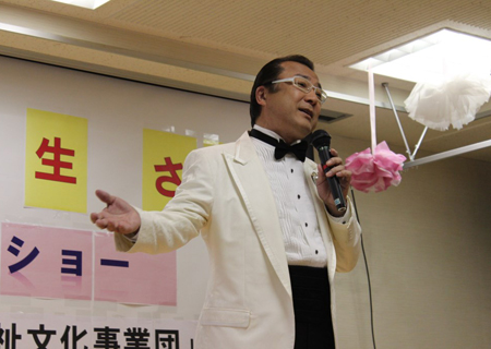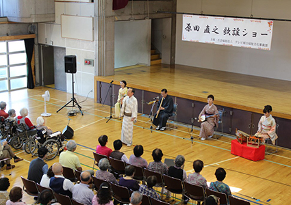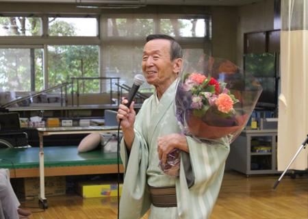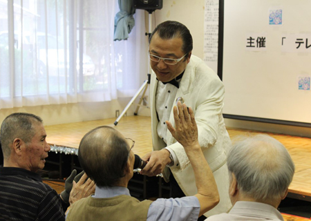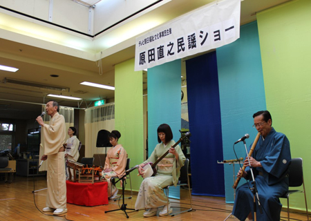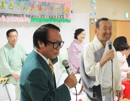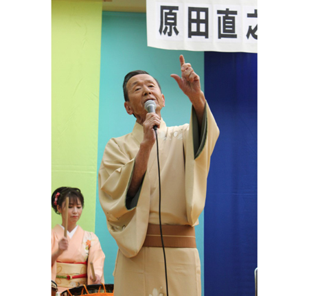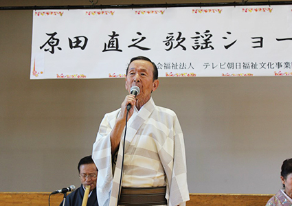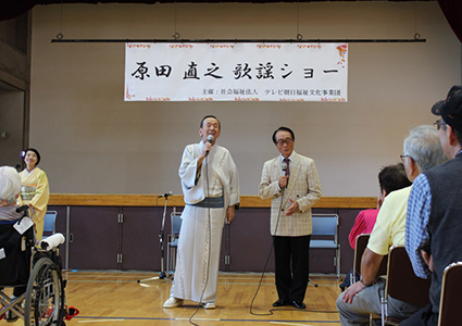 7月4日、座間市の特別養護老人ホーム「サライ」に、原田直之さんをお迎えして歌謡ショーを行いました。当日は、朝から気温がぐんぐん上がり、東京は真夏日を記録しました。会場となった食堂には、デイサービスの利用者30人を含めて100人を超えるお年寄りが集まりました。民謡ショーが始まる10分ほど前から、集まったお年寄りたちが施設職員の方たちと民謡を合唱してショーの始まりを今か今かと心待ちにしている中、司会の早川さんが「民謡歌手として、第一人者の原田直之さんです!」と呼びかけると原田直之さんが登場、大きな拍手で民謡ショーが始まりました。三味線、尺八、鳴り物、お囃子の生演奏で「新相馬節」(福島県)、「大漁唄い込み」(宮城県)、「南部牛追唄」(岩手県)の東日本大震災の被災3県の民謡を披露、「あざみの歌」「達者でナ」などの演歌をカラオケで唄い、全11曲を熱唱しました。「南部牛追唄」では、尺八と原田さんの歌声が会場内に広がり、参加者は真剣に聞き入っていました。途中、衣装替えの後会場のリクエストに応え、「古城」「ドンパン節」(秋田県)「さんさ時雨」(宮城県)「八木節」(群馬県)の4曲を唄うと、会場は大いに盛り上がり、たくさんの笑顔で溢れました。奥様の真木さんを紹介して、「ある夫婦の歌」をデュエットで唄った後、福島県浪江町出身の原田さんが、まだ故郷に戻れない人々に思いを寄せ、東日本大震災復興支援ソング「花は咲く」を参加者と一緒に合唱しました。最後に、「花笠音頭」を唄い、お年寄りから大きな花束を贈られ、参加者全員と記念写真を撮影して無事に終演しました。お年寄りから、「原田さんの素晴らしい歌声に、頭も心もすっきりしました」との感謝の言葉に送られて、興奮冷めやらぬ会場を後にしました。