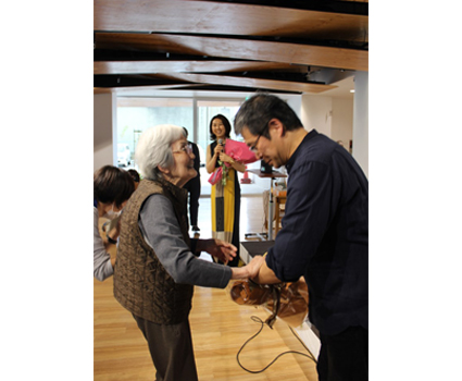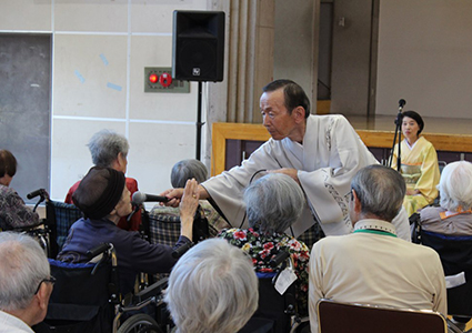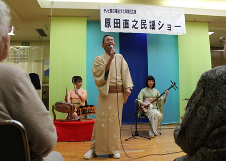 4月12日、豊島区の特別養護老人ホーム「アトリエ村」に、原田直之さんをお連れして歌謡ショーを行いました。当日、朝から青空が広がり東長崎駅前の桜は満開、春らしい好日となりました。会場となった食堂には、デイサービスの利用者など120人ほどのお年寄りが集まりました。「民謡歌手として平成26年に『旭日双光章』を叙勲された原田直之さんです」という司会の早川さんの紹介に会場から拍手喝采が沸き起こり、歌謡ショーが始まりました。三味線、尺八、鳴り物、お囃子で「新相馬節」(福島県)、「大漁唄い込み」(宮城県)、「南部牛追唄」(岩手県)の東日本大震災の被災3県の民謡から、「あざみの歌」などの演歌など含め全11曲を熱唱。「南部牛追唄」では、尺八と原田さんの歌声が会場内に広がり、参加者は真剣に聞き入っていました。故三橋美智也さんの代表曲「武田節」は、今では「山梨の民謡」とみなされることもありますが実は新民謡。尊敬する三橋さんが「民謡はふるさとの心を唄っているものだ」と語っていたことなどを紹介していました。途中、衣装のお色直しがあり、民謡、歌謡曲500曲ほどをいつでも唄えるという原田さんは会場からのリクエストに応えて、「会津磐梯山」「東京音頭」「三階節」「黒田節」の4曲を即興で唄ってくれました。東日本大震災復興支援ソング「花は咲く」では、福島県浪江町出身の原田さんが、被災地の復興を応援していきたいと、参加者と一緒に合唱しました。最後に、お年寄りから大きな花束を贈られ、参加者全員と記念写真を撮影して無事に終演しました。参加した人たちの沢山の感謝の言葉に送られ、会場を後にしました。