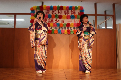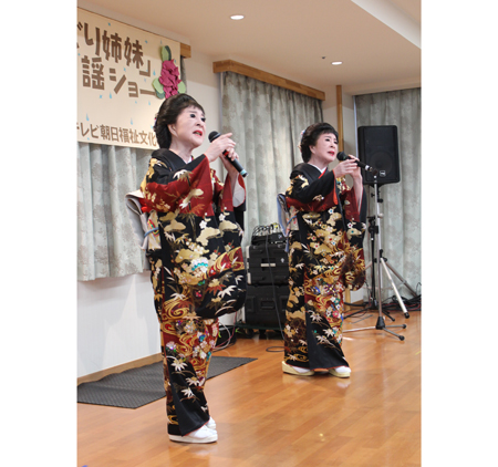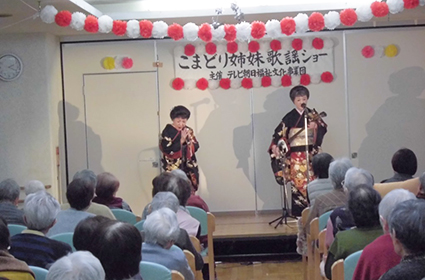 11月24日(木)、大田区の特別養護老人ホーム「池上」に、こまどり姉妹さんをお連れして歌謡ショーを行いました。当日の天候は雪。東京都心では54年ぶりの11月の降雪となりました。最低気温は1度ととても寒い一日になりましたが、施設内の会場には約120名の方々が詰めかけて熱気に包まれていました。歌謡ショーは「ソーラン渡り鳥」から始まり、デビュー曲の「浅草姉妹」など全8曲を披露しました。姉の栄子さんによる「二輪草」の踊りあり、三味線の生演奏による「お吉物語」「岸壁の母」の熱唱ありとバリエーションに富んだ内容で会場の手拍子が大きくなっていきました。唄の間に入るお二人の楽しいエピソードも絶好調で爆笑を誘っていました。また、お二人は波瀾万丈な体験談を切々と語り、悩みや苦しみ、病気に負けないで!と熱いエールを送っていました。エンディングの「こまどりのラーメン渡り鳥」を披露したした後、花束贈呈や記念写真撮影が行われました。参加した方々には思い出深い一日となりました。