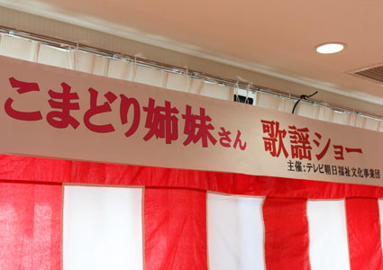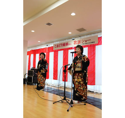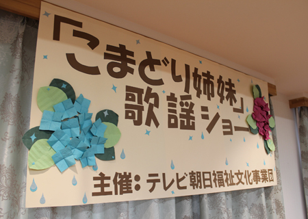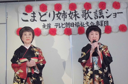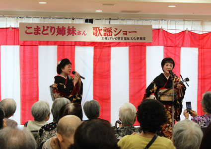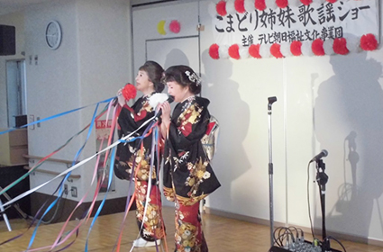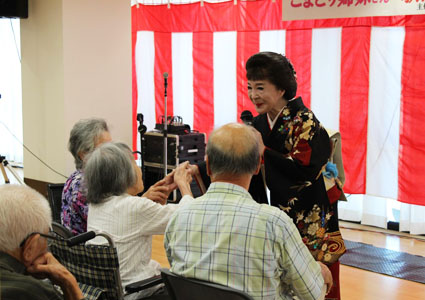 7月19日、江戸川区の特別養護老人ホーム「なぎさ和楽苑」に、こまどり姉妹さんをお連れして、歌謡ショーを行いました。当日は梅雨明けかと思われるような蒸し暑い夏日でしたが、会場となった地域交流スペースには、デイサービスや地域の人たちを含めて140人を超えるお年寄りが集まりました。こまどり姉妹さんが、正面舞台に登場すると拍手喝采でショーが始まり、デビュー曲「浅草姉妹」から2年前に発表した新曲「こまどりのラーメン渡り鳥」まで全9曲を熱唱しました。また、姉の栄子さんが一人で川中美幸さんの代表曲「二輪草」の踊りも披露しました。こまどり姉妹さんは北海道の銭箱出身で、戦後の混乱期には美空ひばりの「悲しい口笛」を人前で唄って家族を支えたという苦労話を参加者は真剣に聞き入っていました。三味線の生演奏で「お吉物語」、「九段の母」、「岸壁の母」を唄うと、会場から大きな掛け声が上がり、参加者の中には、涙ぐむお年寄りもいました。最後に、カラオケでヒットしている新曲「こまどりのラーメン渡り鳥」を唄いましたが、拍手が鳴りやまずに、そのままアンコールで「ソーラン渡り鳥」を、もう一度唄っていただきました。代表のお年寄り2人から花束が贈呈され、参加者全員と記念撮影を行い終演となりました。参加した方から、「往年のスターが目の前で唄ってくれて、素敵な思い出になりました」との感謝の声に送られて、施設を後にしました。