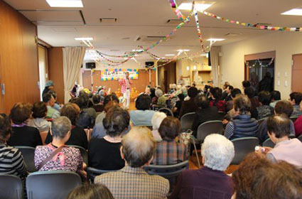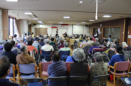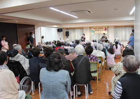 午後雨の天気予報にもかかわらず、からりと晴れた3月1日。その日は、社会福祉法人「小茂根の郷」設立20周年。その中にある特別養護老人ホーム「東京武蔵野ホーム」の会場には、入所している車椅子の方が約30人、デイサービスに通う方約60人、家族や近所の方を含め約120人が来場しました。