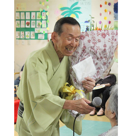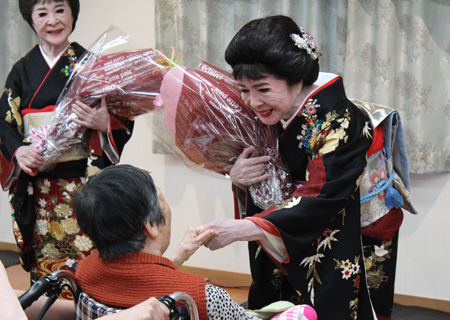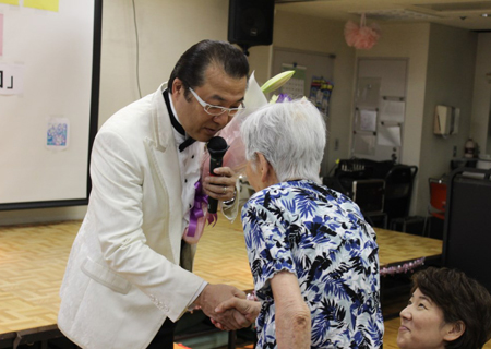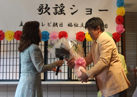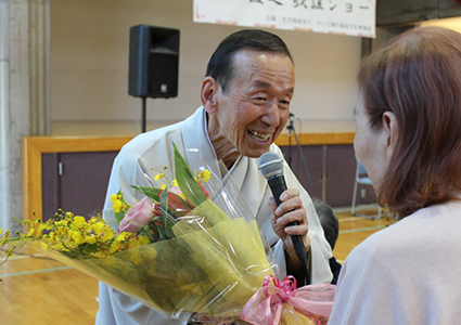 アンコールには、「スーダラ節」を披露し、全11曲を熱唱。1時間のショーが終了しました。来場者数は110人、参加者の男女比は3:7、平均年齢85才。入所者には100才以上がお二人いらっしゃるとか・・・。ご家族の方と手をつないで、コンサートを楽しむ方もお見かけしました。最後に大島花子さんには男性から、笹子重治さんには女性から花束が贈呈されました。すると何やら笹子さんがにっこり・・・、ふと見ると、プレゼンターの女性が笹子さんの肩をポンポンたたいていました。後でお聞きしたところ、その方は亡くなったご主人を笹子さんに重ね、「頑張りなさいよ!」と励ましていたそうで、私たちも全員、元気と笑いをもらった施設訪問になりました。