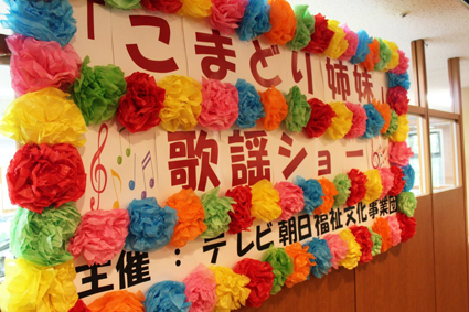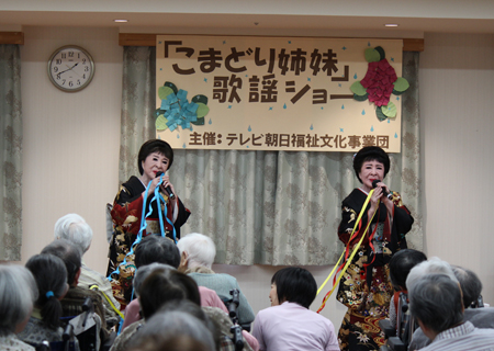 5月16日、練馬区の特別養護老人ホーム「第3育秀苑」に、こまどり姉妹さんをお連れして、歌謡ショーを行いました。当日は、新緑が目にやさしく映える、五月晴れの穏やかな日になりました。会場には、デイサービスや地域の人たちを含めて、80人を超えるお年寄りが集まりました。こまどり姉妹さんが、正面舞台に登場すると拍手喝采で歌謡ショーが始まりました。「ソーラン渡り鳥」「浅草姉妹」など全8曲を熱唱。浅草で流しをしていた頃によく唄ったという「三味線姉妹」では、会場から紙テープが投じられるという嬉しいハプニングがありました。「ショーで紙テープが投げられたのは本当に久しぶりのことです」とお二人が感激していました。また、こまどり姉妹・姉の栄子さんが、川中美幸さんの代表曲で「二輪草」の踊りを披露したり後半には、三味線コーナーもあり盛りだくさんのショーになりました。「お吉物語」「岸壁の母」「こまどりのラーメン渡り鳥」を、多くの参加者が一緒に唄い、中には涙ぐむお年寄りもいました。予定した曲を唄い終わっても拍手が鳴りやまず、アンコールで「ソーラン渡り鳥」を、もう一度唄って頂きました。最後に、施設代表のお年寄り2人から花束が贈呈され、参加者全員と記念撮影を行い終演となりました。参加者から、「ほんとうによかった。こまどり姉妹さんに励まされました」と感謝の言葉を頂きました。