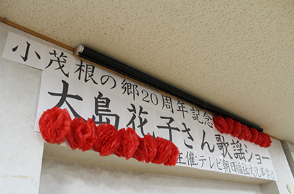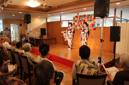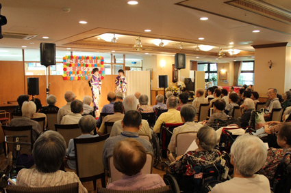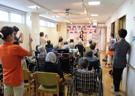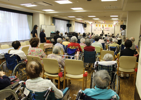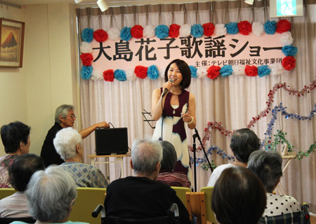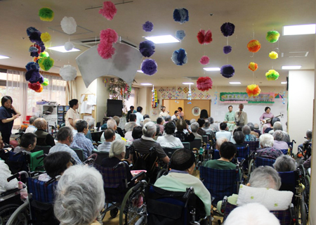 今回の観客は約40名。入所者のほとんどが車椅子を使用しており、外出もままなりません。そんなお年寄りが願っていた「大島花子さんのステージ」をプレゼントでき、私たちスタッフも最高の七夕となりました。