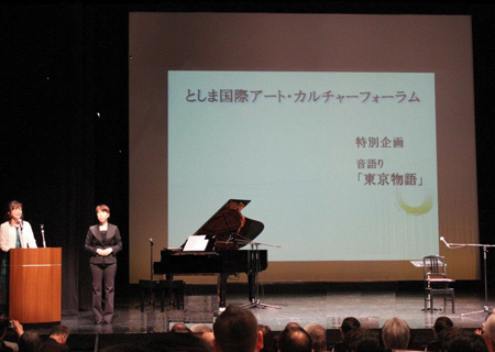 夏日となった5月5日の子どもの日に東池袋の「あうるすぽっと」で女優・中井貴惠さんが小津安二郎監督作品の脚本をジャズピアニスト松本峰明さんのピアノ演奏と共に朗読する「音語り 東京物語」を開催しました。これはテレビ朝日福祉文化事業団が地域における公益的な取組として各自治体に働きかけ、各地域の生涯学習や住民サービスなどのニーズに合わせて開催しているもので、今回は豊島区・東京芸術劇場・(公財)としま未来文化財団が新たにスタートさせた「としま国際アート・カルチャーフォーラム」の第一回目の特別企画として、としま国際アート・カルチャーフォーラム実行委員会と共催で行いました。