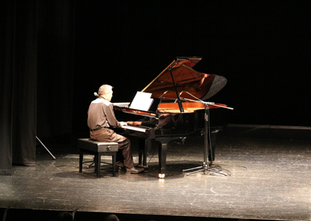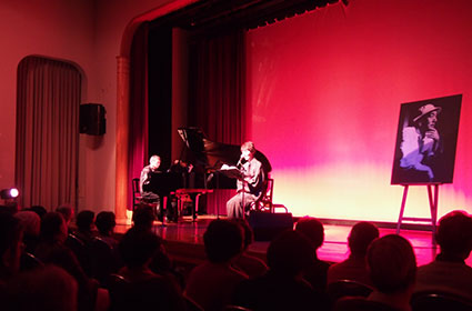 当日は小津映画のファンを含む地域の方約240名が参加しました。この朗読公演の前半はジャズピアニスト松本峰明さんと中井貴惠さんのトークです。土地柄、来場者は幼いころの小津監督との思い出話に、皆熱心に、時には頷きながら、時には笑いながら聞き入っていました。松本峰明さんの「君の名は」の演奏後に本編の音語りが始まりました。小津映画の代表作「東京物語」の錚々たるキャスト、主人公の老夫婦から3人の子どもたち、未亡人となった次男の嫁など出演者1人1人を中井さんが見事に演じ分け、観客を終戦からわずか8年の戦後の日本に誘います。映画では映像だけで表現されている風景や人物の表情なども丁寧に語られ、松本峰明さんの奏でる穏やかでどこか物悲しいピアノの音色と相まって、朝の海岸の清々しさや義母の形見の時計を見つめる嫁の悲しみも観客の心の中にその像が結ばれていくようでした。最後に妻に先立たれた老父が一人残された尾道の部屋に孤独が忍び寄る場面では夕暮れが迫るかのように明かりが落ち、観客はその余韻に浸りながら舞台に向かって大きな拍手を送りました。